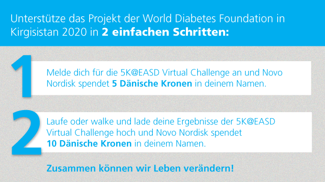 5K@EASD Lauf/Walk um Diabetes zu verändern ![]() Mach mit bei der 5K@EASD Virtual Challenge von 19. bis 23. September 2020 – du kannst jederzeit von überall loslaufen! Die 5K@EASD Virtual Challenge verbindet Leute auf der ganzen Welt und zeigt im Namen der EASD auf, wie wichtig körperliche Aktivität für die Vermeidung von Diabetes ist. Als TeilnehmerIn der 5K@EASD Virtual Challenge hat man die Möglichkeit, das öffentliche Bewusstsein für einen gesunden und aktiven Lebensstil für die Vermeidung und Kontrolle von Diabetes zu stärken. Dank der kontinuierlichen Unterstützung von Novo Nordisk ist die 5K@EASD Virtual Challenge kostenlos für alle Teilnehmerinnen und Teilnehmer. Mach den ersten Schritt für ein gesünderes Leben: 2020 feiern wir das 15. Jubiläum der Unterstützung von Novo Nordisk für den 5K@EASD! Um auch dieses Jahr auf Diabetes aufmerksam zu machen, laden wir alle Wienerinnen und Wiener ein, in ihrer Heimatstadt zu laufen oder zu walken! Die Teilnahme ist kostenlos für alle Registrierten. Die Registrierung ist verpflichtend für die Teilnahme an der 5K@EASD Virtual Challenge. Zur Feier des 15. Jubiläums, möchte Novo Nordisk alle Teilnehmerinnen und Teilnehmer motivieren, das Projekt der World Diabetes Foundation (WDF) 2020 in Kirgisistan zu unterstützen. Die Einnahmen dieser WDF Initiative kommen zu 100% dem WDF Kirgisistan Projekt 2020 zugute. Novo Nordisk spendet im Namen der ersten 10.000 angemeldeten Teilnehmer und Finisher. Weitere Informationen zum Projekt findest du hier.